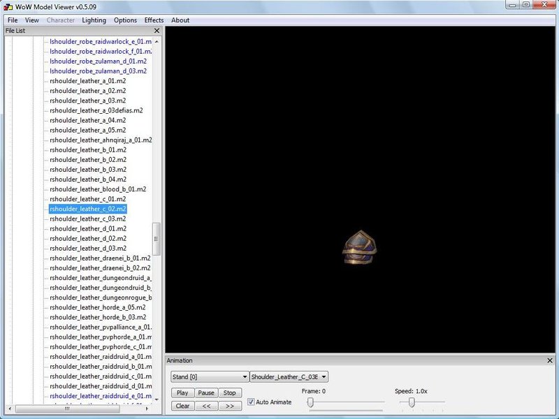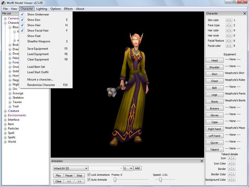 1А. Сначала нужно определиться кого мы будем извлекать и с каким набором брони. Для этого очень удобно использовать программу WoW Model Viewer. Запускаем её, выбираем нужного перса, затем собираем его обмундирование - это делается на панели справа от окна просмотра модели.