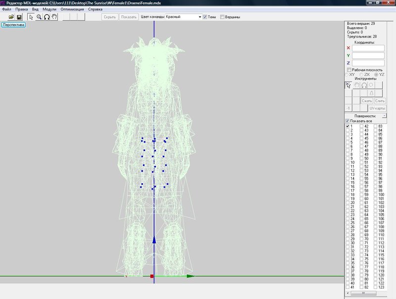 6А. Теперь надо избавиться от лишних поверхностей, для начала оптимизируем модель, затем смотря на имеющийся скриншот из WoW Model Viewer, выбираем и оставляем нужные нам наколенники, причёску, рукавицы, и т.п. Каждая поверхность должна быть только одна, одинаковые удаляем.