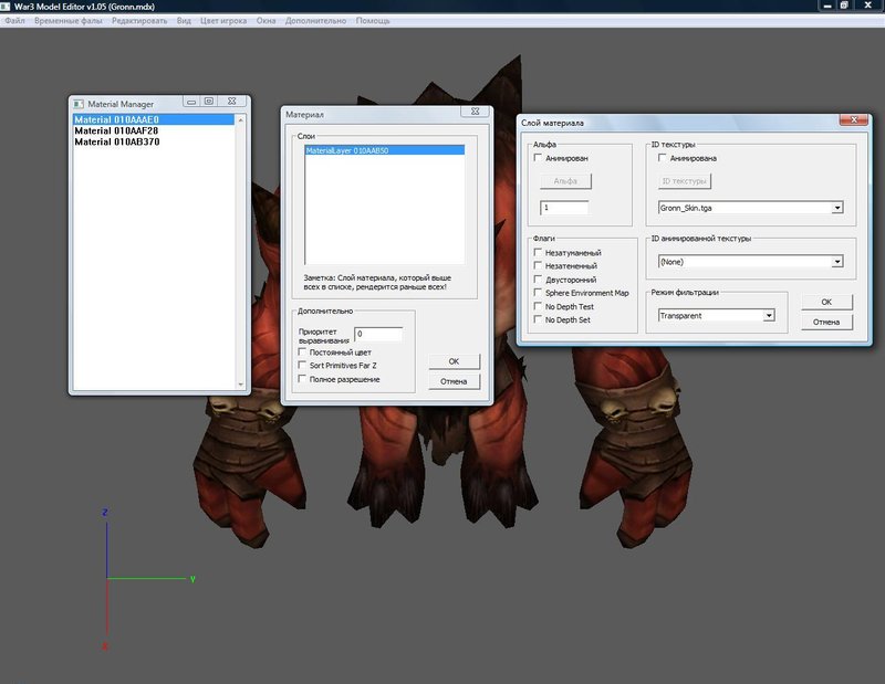 9А. Открывает нашу модель в War3ModelEditor, там выбираем "Окна - редактор материалов" и в открытом окне редактируем материалы так, что бы там не оставалось ненужных текстур, выявленных нами в пункте 5А. Затем в "Окна - менеджер текстур" окончательно удаляем лишние анимации. Осторожнее при удалении в менеджере текстур вам может выпасть окошко, что текстура нужна для для источника частиц, если такое случилось, то вам придётся искать нужную текстуру в пункте 3 либо избавиться от источника частиц. Советую просмотреть, чем является данный источник частиц (свечение, дым, огонь) и заменить его текстуру на стандартную, которую можно легко найти в архивах Warcraft.