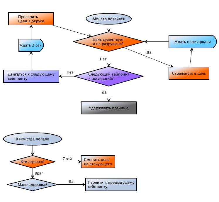 Из зелёных точек наступают корованы вражеские монстры, они тоже стреляют камнями, продвигаясь по дорожкам к их целевой точке, пытаясь уничтожить все xdestr'ы на пути. У них есть определенное здоровье.