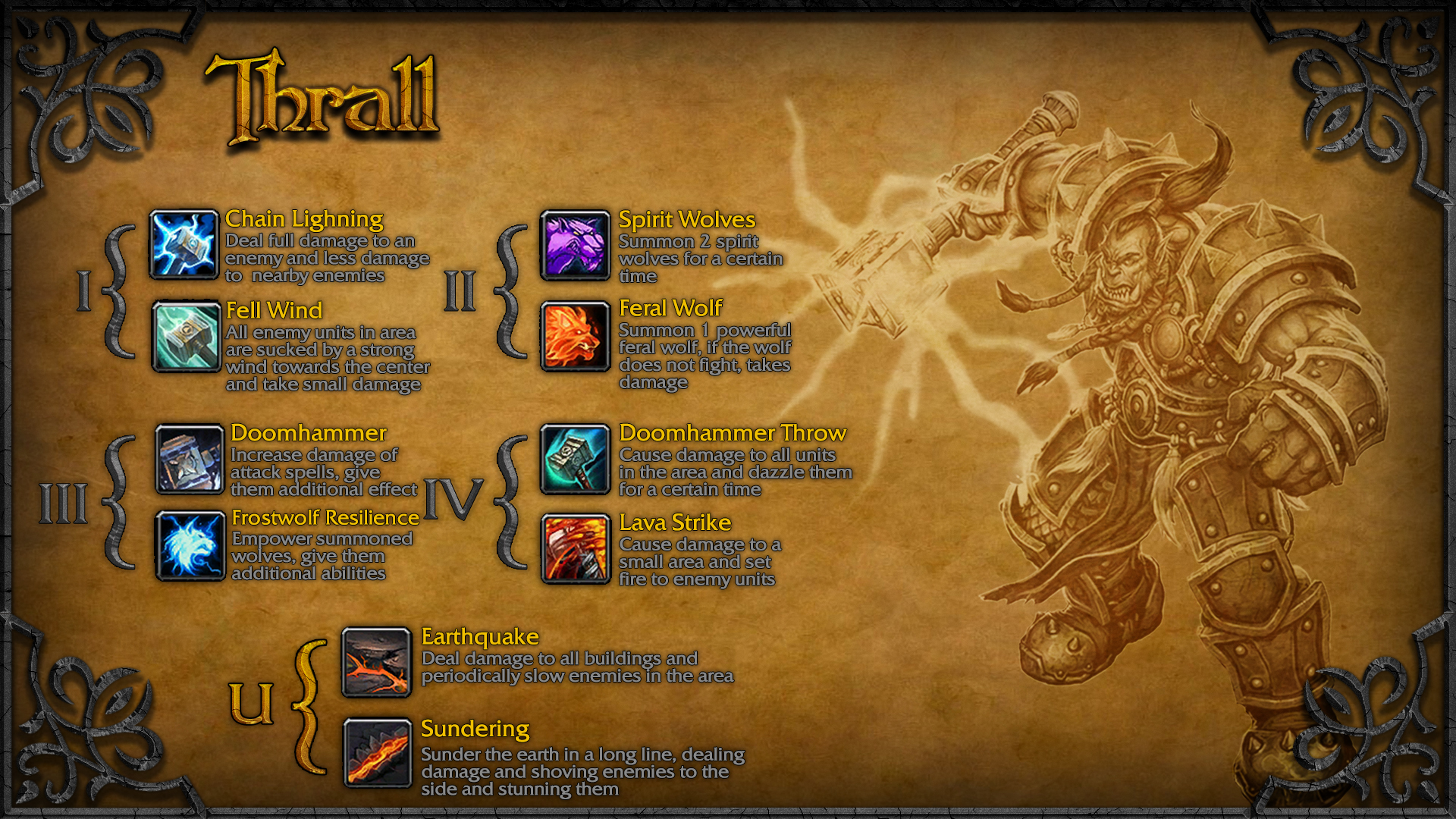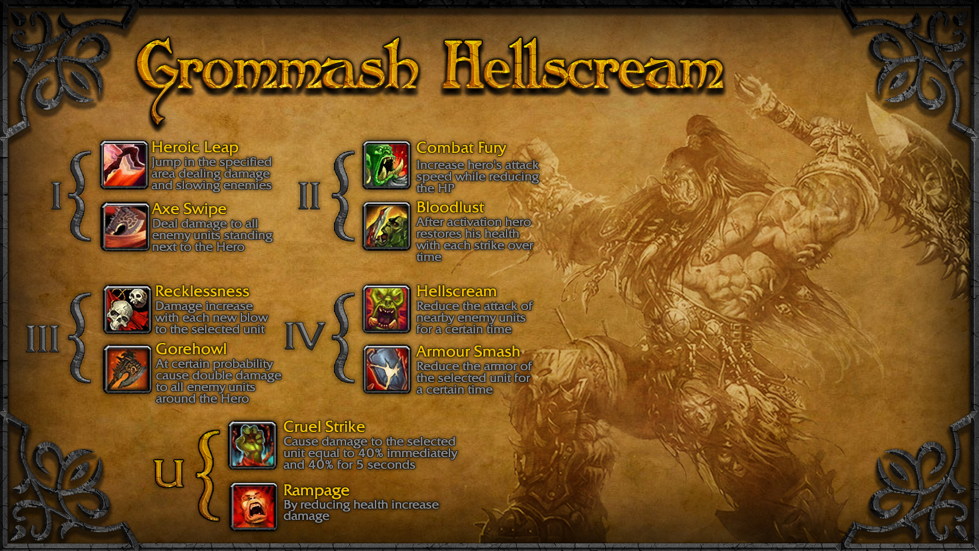 Предполагается, что у каждого героя будет 5 способностей: 3 активных, 1 пассивная и 1 так называемая "ульта". Дополнительно к этому был изменен концепт абилок Громмаша, чтобы он больше вписывался в Лор, а так же развиты способности Тралла.