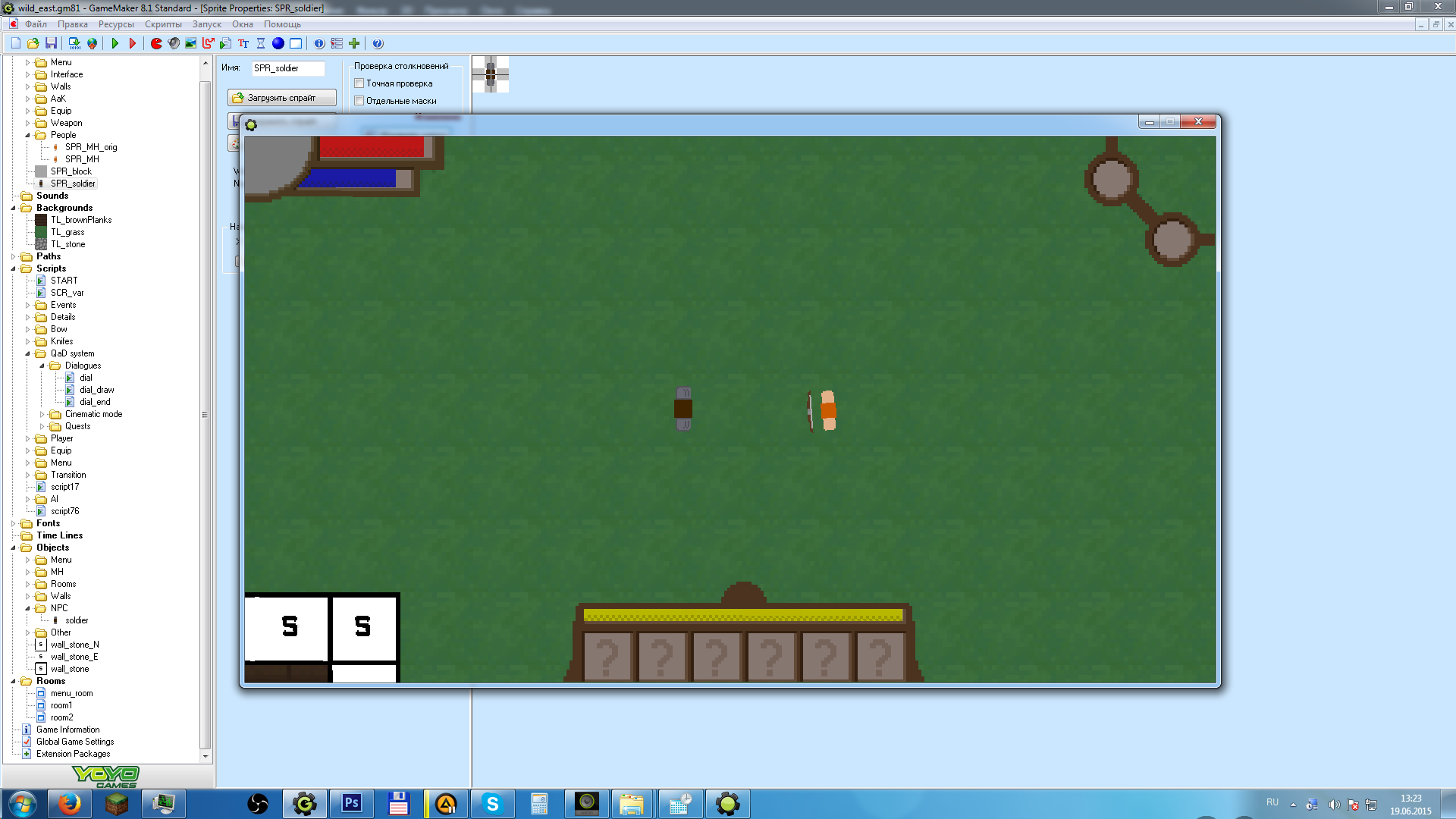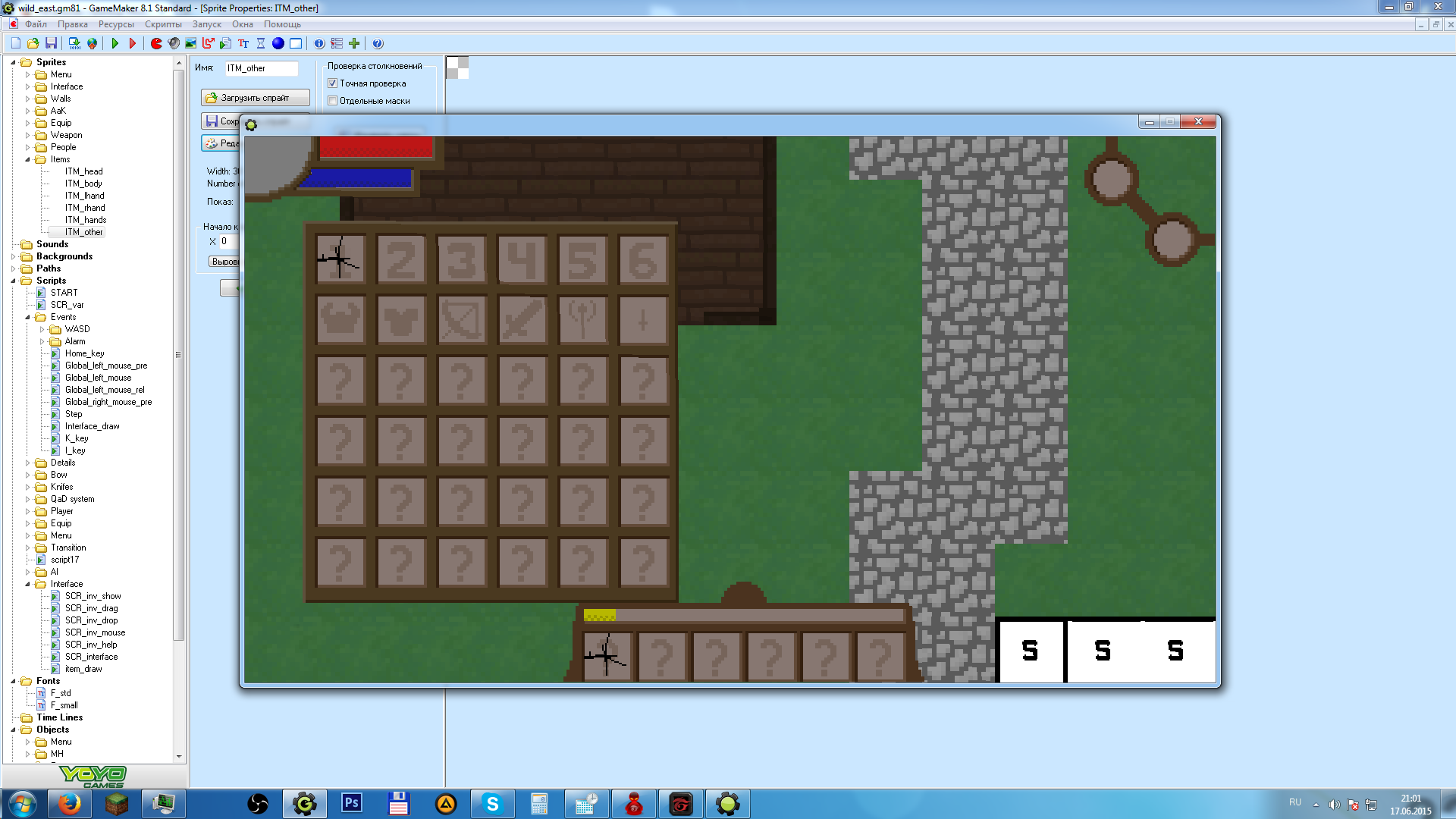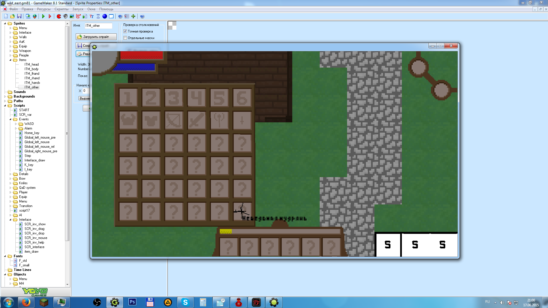 Запилил инвентарь. Как можно видеть, все нормально отображается. Предметы перетаскиваются из ячейки в ячейку, шесть предметов в верхней строке инвентаря соответствуют шести предметам в панели быстрого доступа. А еще при наведении курсора на предмет отображается его название.