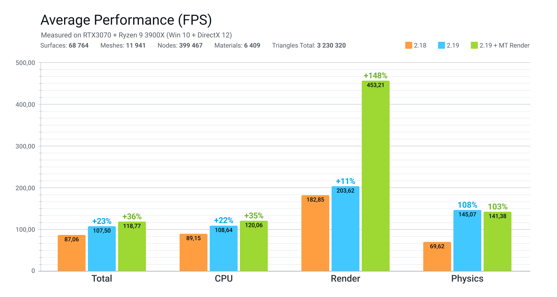 Реализован многопоточный рендер для DirectX12, который существенно улучшил производительность процессора за счет эффективного использования всех имеющихся ядер, обеспечив заметный прирост.