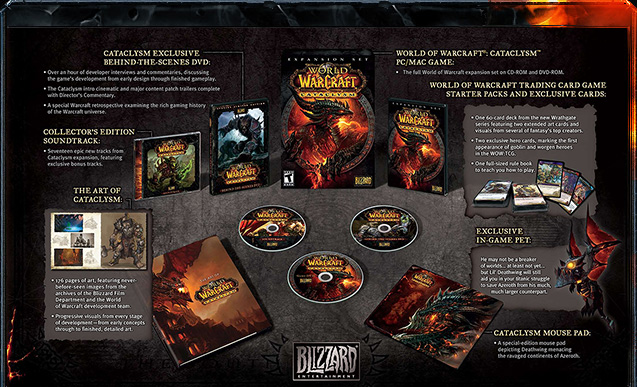 Blizzard анонсировала коллекционную версию нового дополнения для WoW. В коробке нас ждет 176-страничный арт-бук, питомец Lil' Deathwing (внутриигровой), DVD c роликами о разработке игры, CD c 10 музыкальными треками из аддона, эксклюзивный коврик для мыши с изображением Deathwing, а также набор карт из World of Warcraft Trading Card Game.