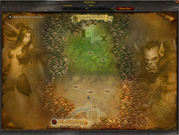 На поле две базы - Silverwing Hold эльфов на севере и Warsong Lumber Mill орков на юге. Местность между ними покрыта деревьями и кустарниками – идеальное места для засад и маневров.