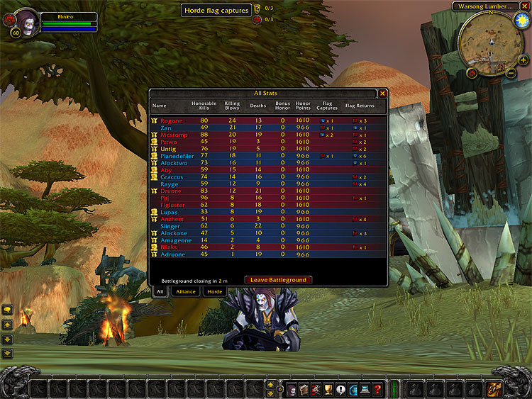 Как только вы зайдете в ущелье через красный портал, вы заметите счетчик очков наверху экрана. На миникарте также появится кнопка, которая открывает статистику всех игроков на поле, показывая количество Достойных убийств (Honorable Kills), финальных ударов, очков Достоинства (Honor Points), принесенных и вернутых флагов. Ко всем последующих полях интерфейс будет специально подстраиваться.