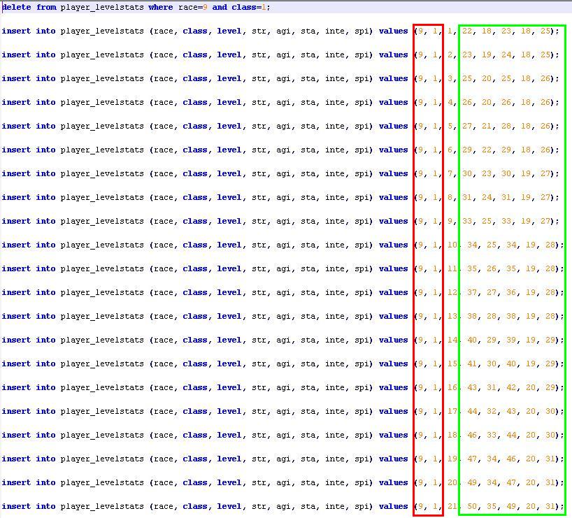 Красным цветом выделено ид расы и класса. Без выделения (то что между зеленым и красным) уровень. Зеленым цветом (с лева на право) сила, ловкость, выносливость, интелект, и дух.
