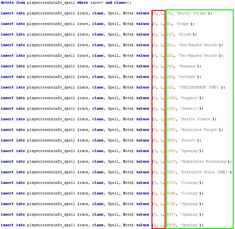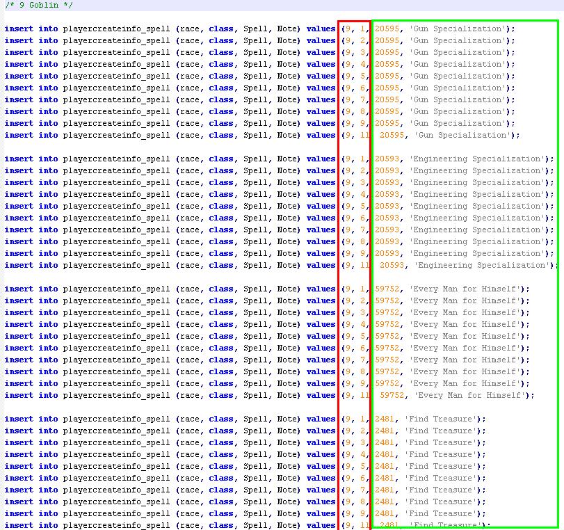 Открываем файл spellfix.sql Тут будут расовые способности, которые будут при старте.