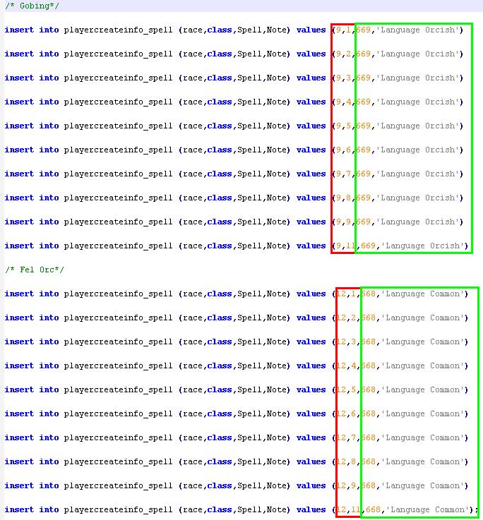 Красным цветом выделено ид расы и класса. Зеленым цветом ид языка и название.