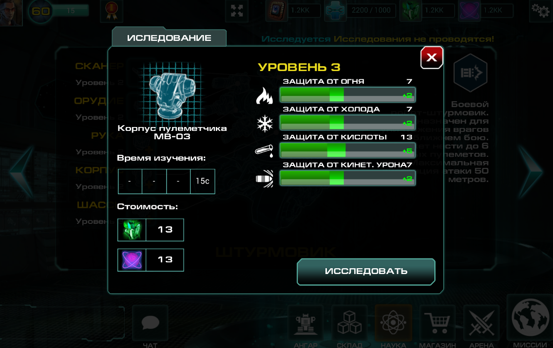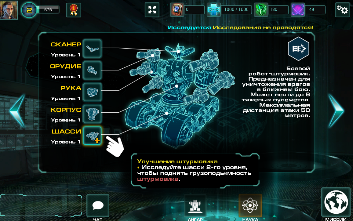 Игрок может проводить исследования, увеличивающие уровень основных деталей боевых роботов. Максимальный уровень любого исследования ограничен уровнем игрока.
