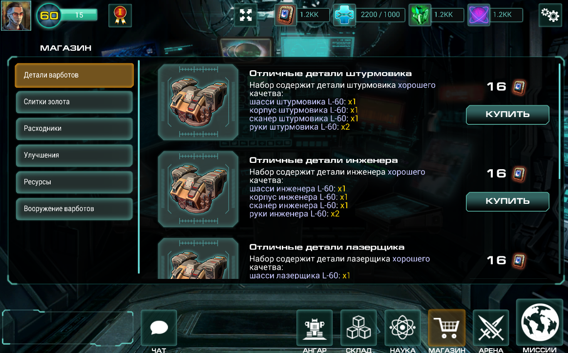 На данный момент в игре присутствует 60 видов вооружения и 60 деталей варботов.