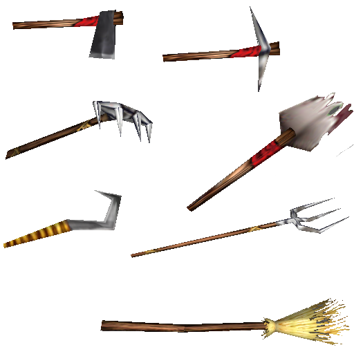 Лопата, кирка, топор, серп (сакля), вилы, грабли, метла, молоток, гаечный ключ.