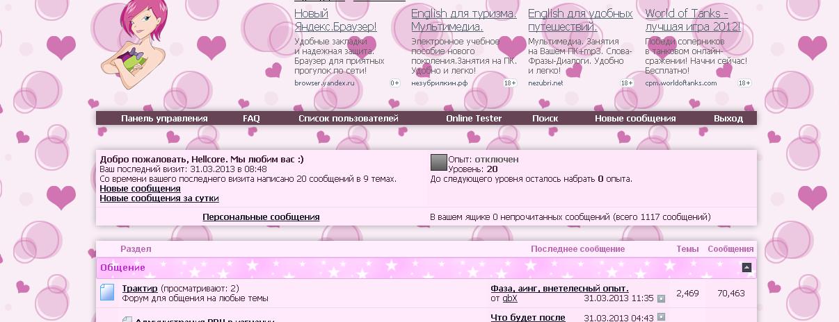 Все старые стили к сожалению будут отключены, но это не так страшно. Зато представьте как любят девочки сидеть на женских форумах, а любой женский форум должен быть розовым и с сердечками. Теперь наш форум будет привлекать девушек для обсуждения различных интересных им тем (парни, косметика, киношки) а заодно они будут интересоваться и модмейкингом.