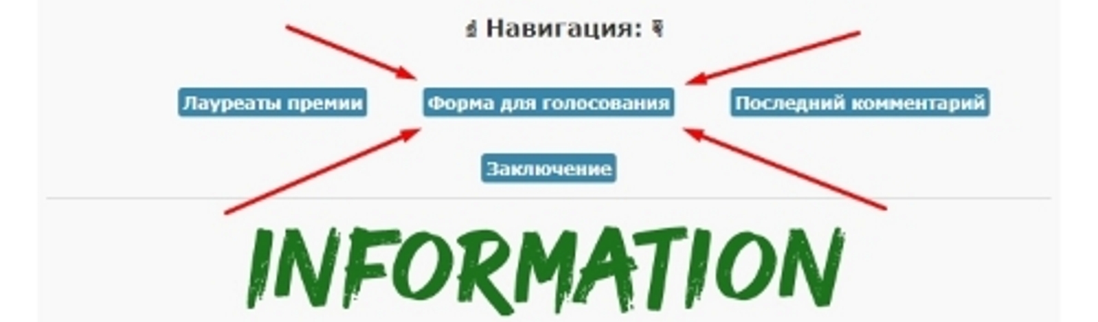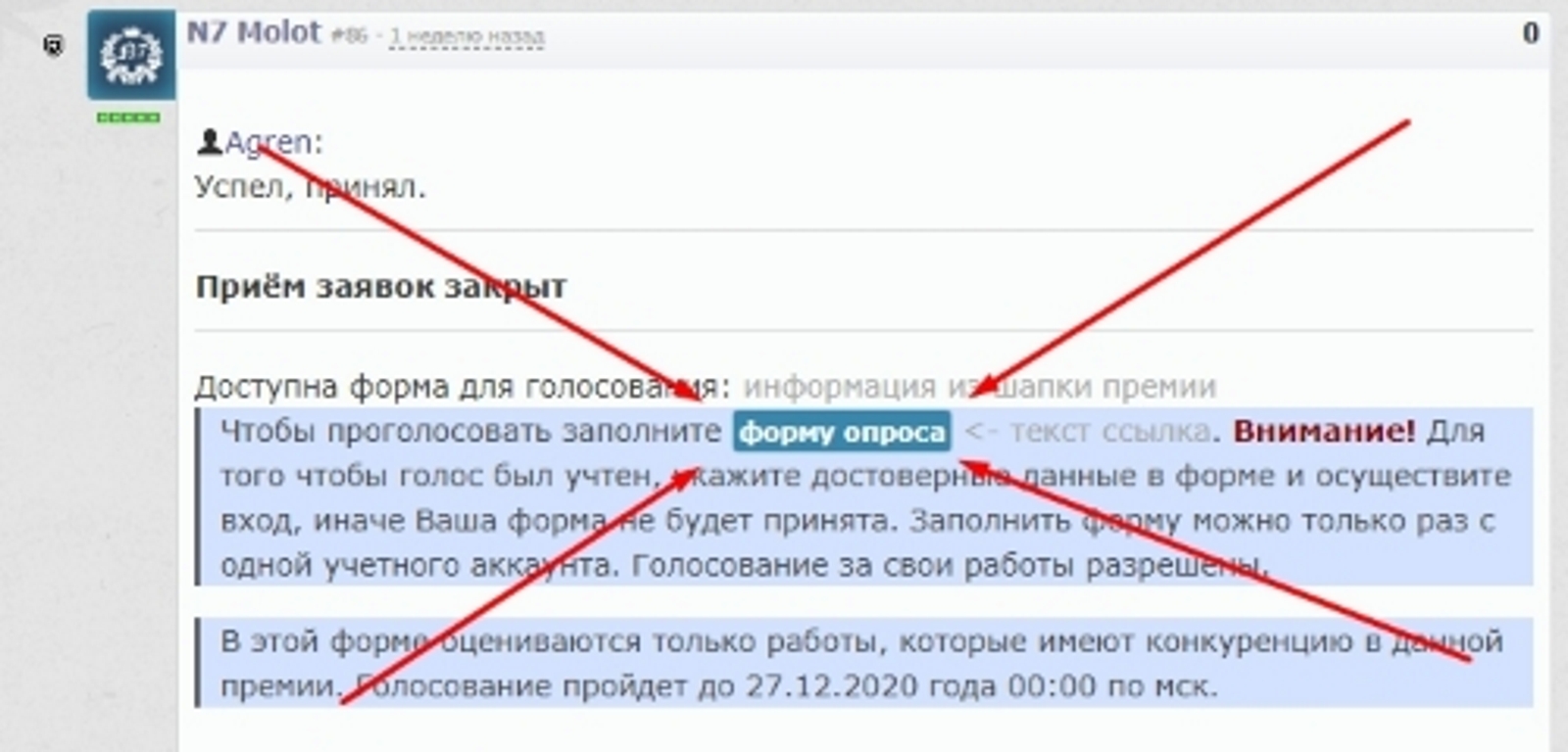 Чтобы проголосовать заполните форму опроса <- текст ссылка. Внимание! Для того чтобы голос был учтен, укажите достоверные данные в форме и осуществите вход, иначе Ваша форма не будет принята. Заполнить форму можно только раз с одной учетного аккаунта. Голосование за свои работы разрешены.