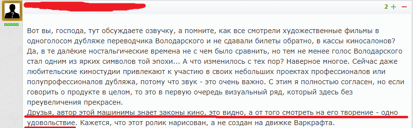 Синее пламя, как и все твои машинимы, сделаны неплохо технически(ландшафты, анимации, триггеры), но с точки зрения режиссуры и экранизации это посредственность. Ты просто напросто берешь чужие книги и ТОПОРНО точь в точь переносишь в машинимы, из-за чего убиваешь интересный первоисточник. Так экранизации не делают, книги есть книги, там свои правила. Вот и спрашивается, зачем людям смотреть посредственную экранизацию, если можно почитать интересный первоисточник? У меня же по другому, у меня исключительно авторский контент, над которым я стараюсь и развиваю с годами.