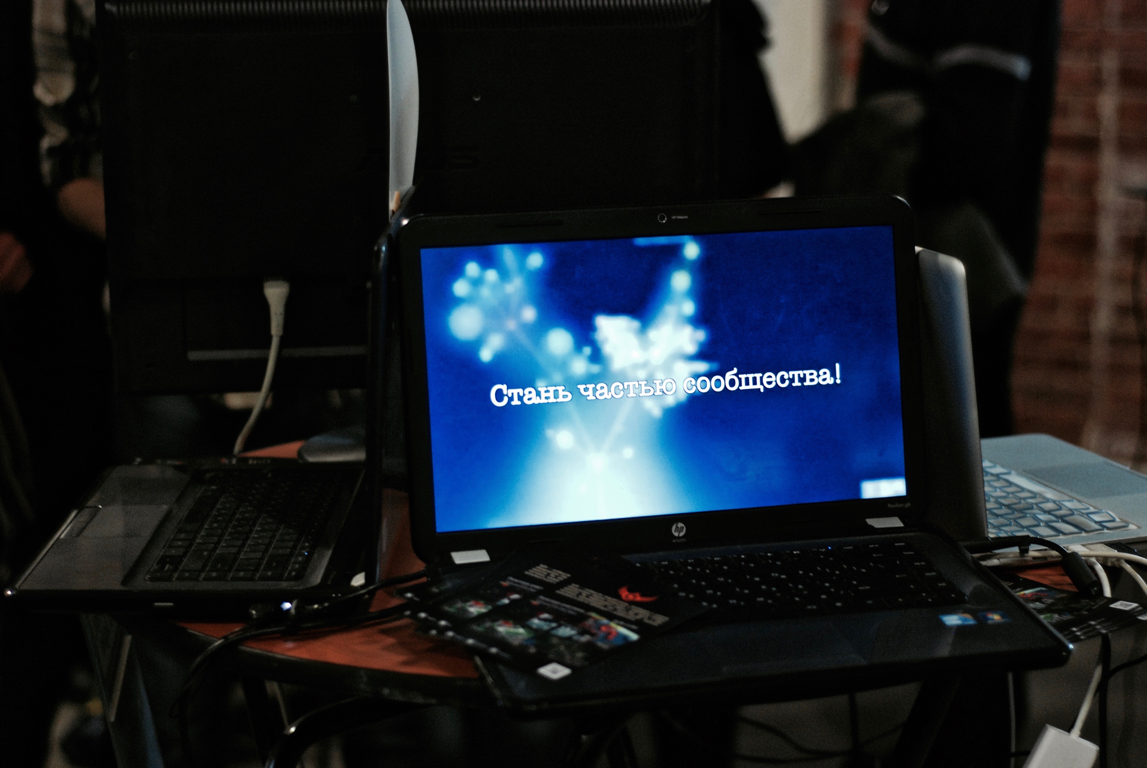 Кто бы мог знать, что Олег так серьезно отнесется к мероприятию и притащит целый походный рюкзак достаточно большого литража на выставку. В комплекте был огромный роллап, два монитора, системный блок, ноутбук, халаты и многое, многое другое. На сборку стенда понадобилось около часа. Kozinaka заряжал всех своими эмоциями, так что тяжело было даже ровно держать отвертку. Но в итоге всё получилось.