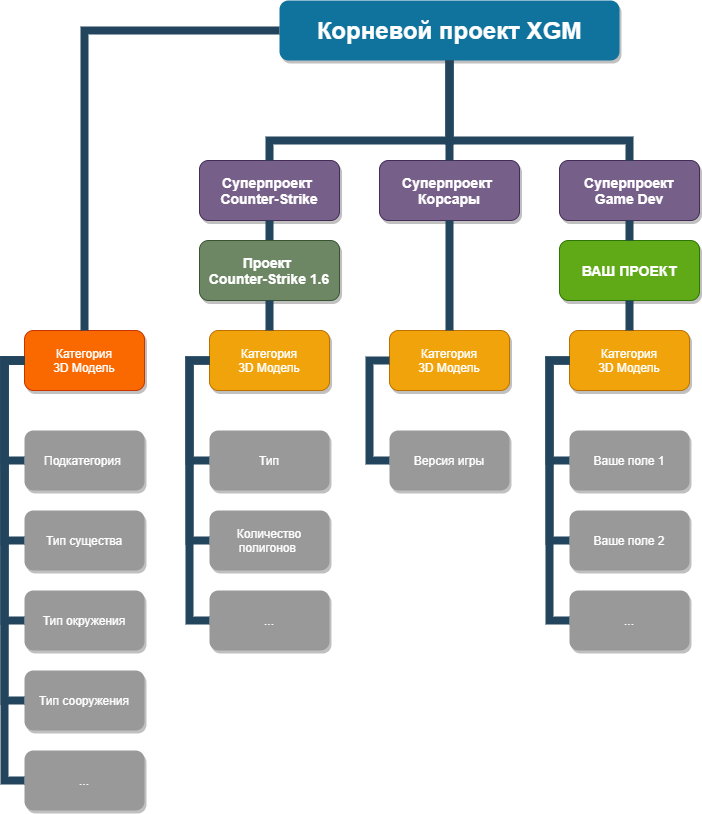 Категории наследуются из проекта XGM и суперпроектов, поэтому поиск производится с учетом иерархии.