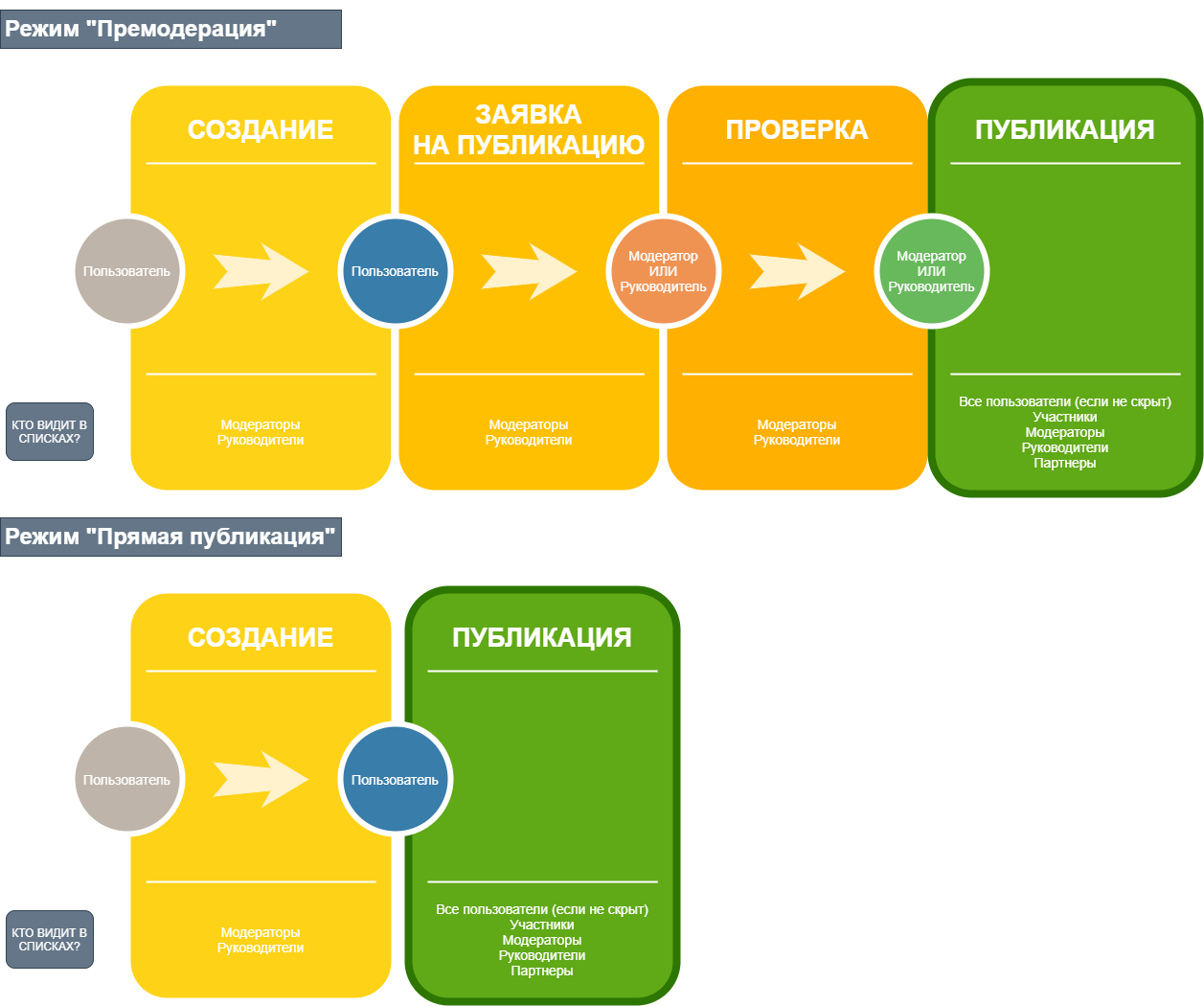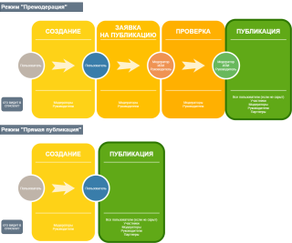 Проект может иметь разные настройки прав - включить премодерацию или прямую публикацию ресурсов.