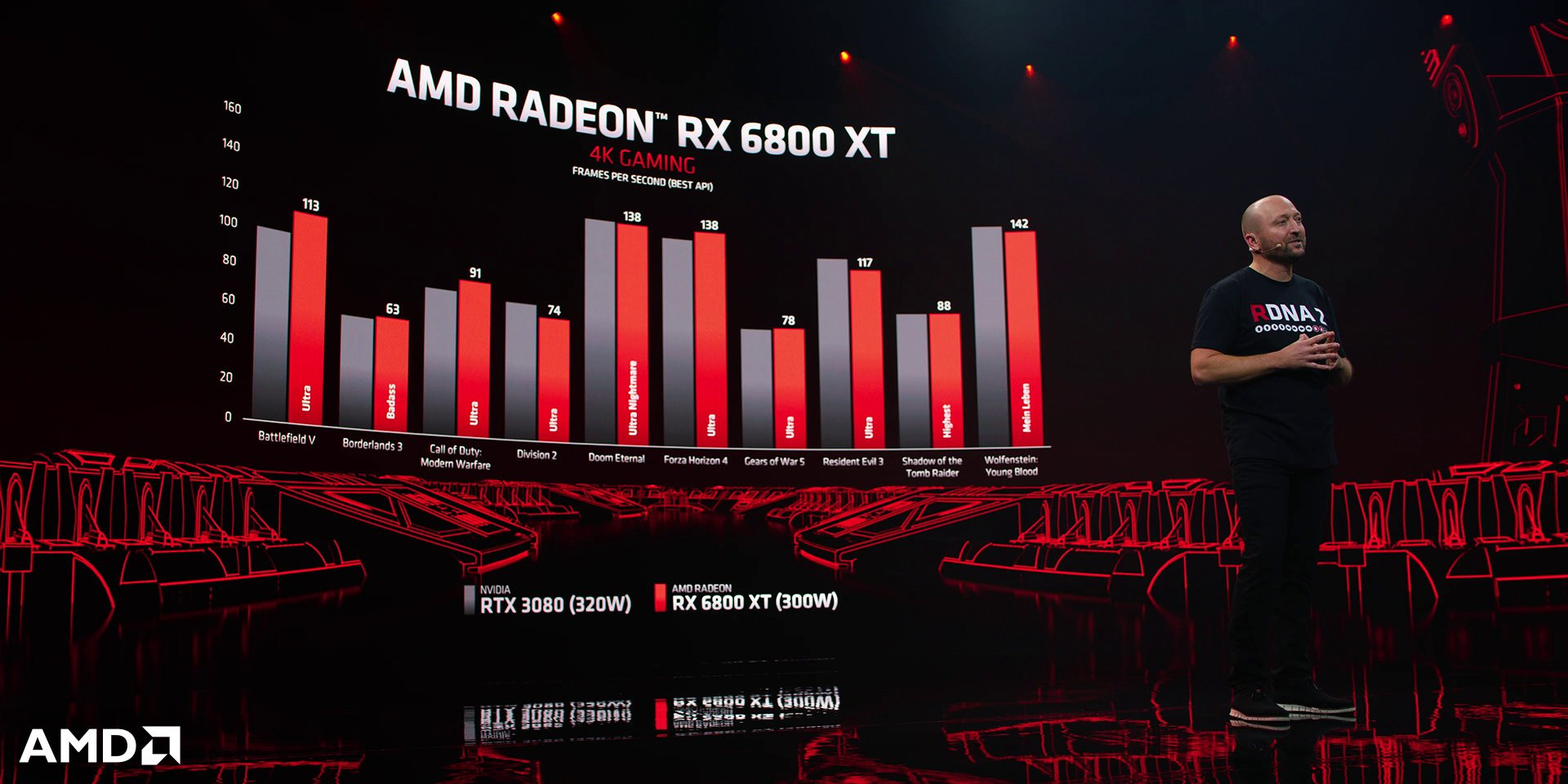 Тесты в 4К против NVIDIA GeForce RTX 3080 - в большинстве случаев результаты сопоставимы, однако в играх вроде Battlefield V, Call of Duty: Modern Warfare и Gears 5 модель AMD превосходит конкурента.
