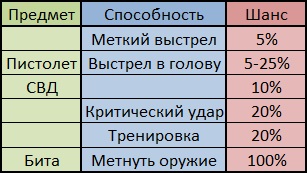 - Пистолет - Выстрел в голову - нужен пистолет; при прокачке шанс растёт от 5% до 25%.