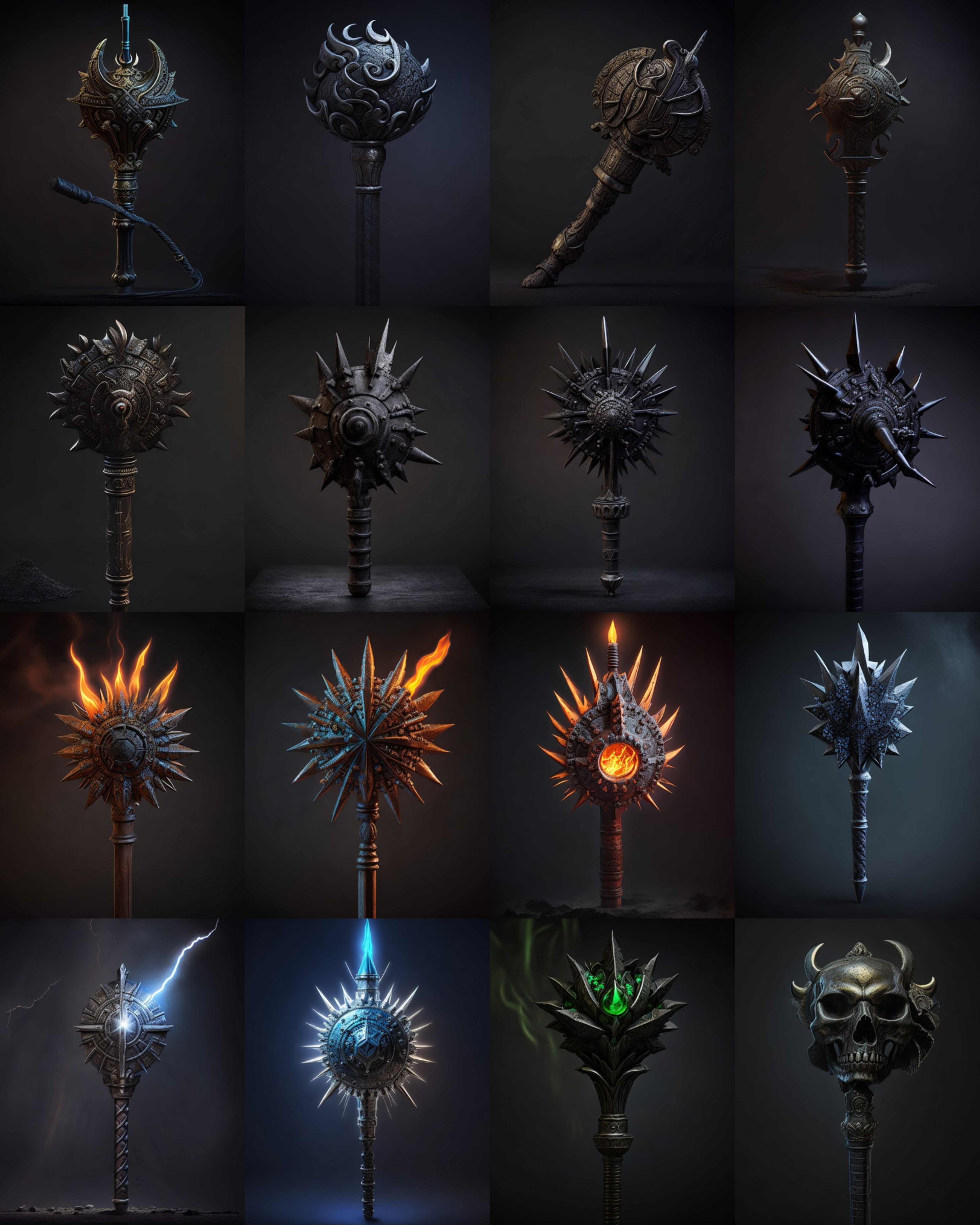Набор из 18 фэнтези иконок посохов различных стихий. Созданы с помощью ИИ.