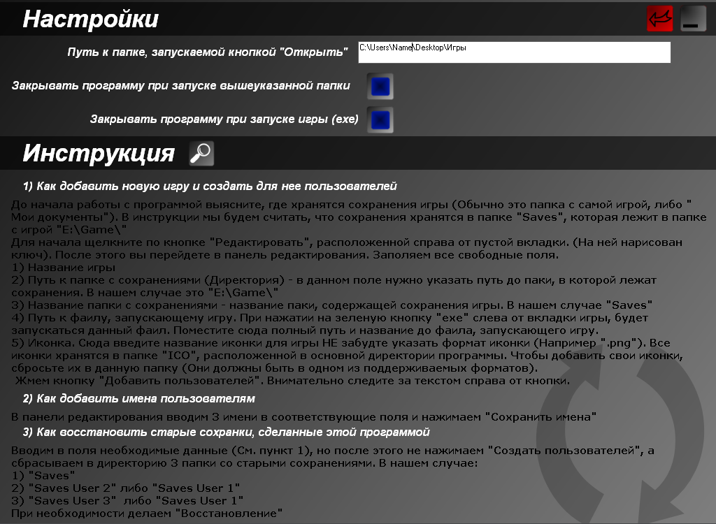 MOGAS (Manager of games and saves) - это программа, позволяющая создавать пользователей практически для любой игры. Все, что требуется от пользователя, найти, где хранятся сохранения от игры (Например: C:\Users\MyName\Documents) и заполнить все поля окна настройки. Все! Можно спокойно выбирать одного из трех пользователей.