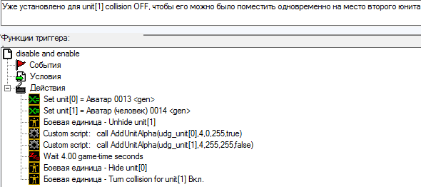 В кинематике один юнит превращается в другого, для этого помещаю обоих на одну позицию, у второго ставлю прозрачность 100%, далее происходит превращение, когда первый юнит периодически теряет прозрачность, а второй периодически приобретает. Так как полностью потерять прозрачность от этого триггера не получается и что-то малоразличимое остаётся, то по истечению времени исчезающего первого юнита прячу(hide).