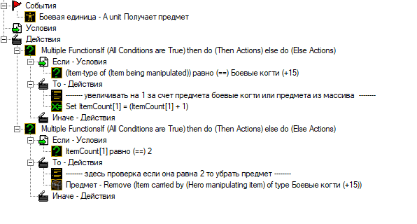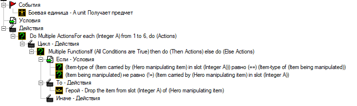 проверяет если герой получил предмет ...потм идет проверка полученного предмета и в другое условие проверяется сколько предметов в инвентаре если в инвентаре 2 предмета такого типа убрать его...ну тут и цикл от 1 д 6 нужен и потом почищать переменную нужно если герой теряет предмет itemcount = itemcount - 1