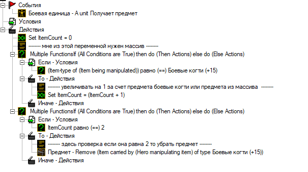 вот есть массив предметов тип переменной Тип Предмета с порядковым номером и есть целочисленная переменная..если герой получил предмет ItemType[1] увеличивать целочисленную переменную на 1 за счет этого предмета если индекс дошел до 2 то убрать предмет..это не должно работать для других предметов которые не указаны в ItemType