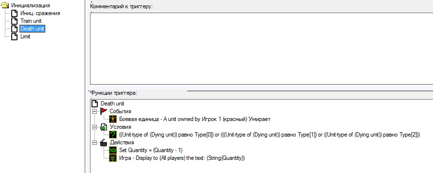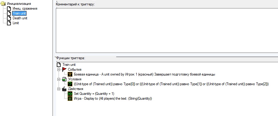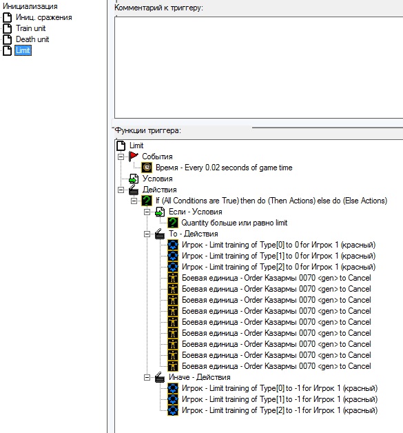Proshel_Doty, сделал в три триггера. Работает, теперь надо как-то модифицировать. Триггер limit делает, всё как надо: если игрок вздумает создать очередь из 7 юнитов, то они не построятся. Только теперь в этой казарме нельзя построить или исследовать.