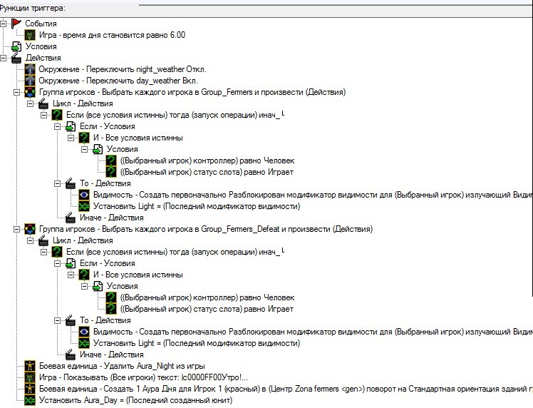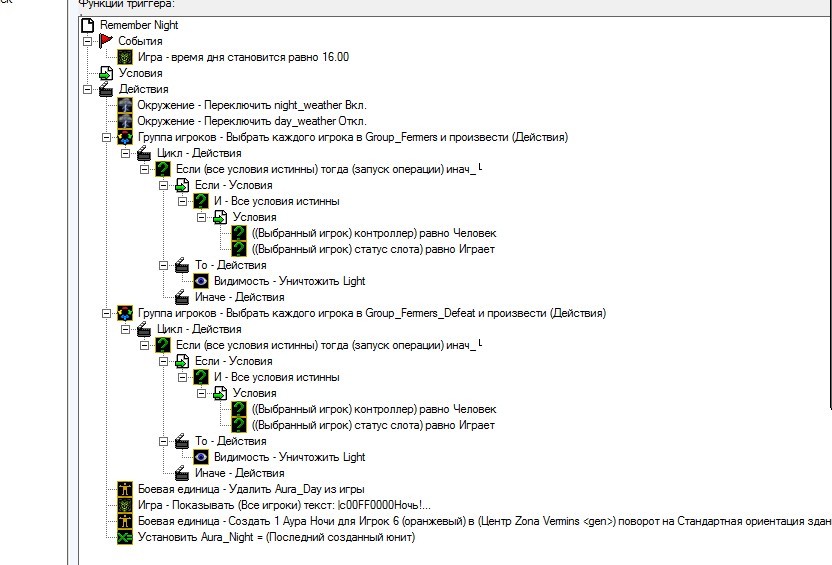 А в чём трудность то ? Наступило 16:00 , выбрать всех юнитов переменная-"Item" , вкл триггер "night"(каждую сек проверять есть ли у Item предмет х?Если есть добавить +15 урона(к примеру) . Наступило утро 6:00 выкл nigt выбрать всех юнитов item и убрать +15 урона . Item записываем тогда , когда юнит получил/взял предмет .