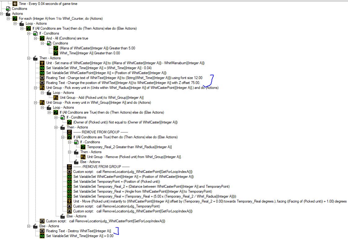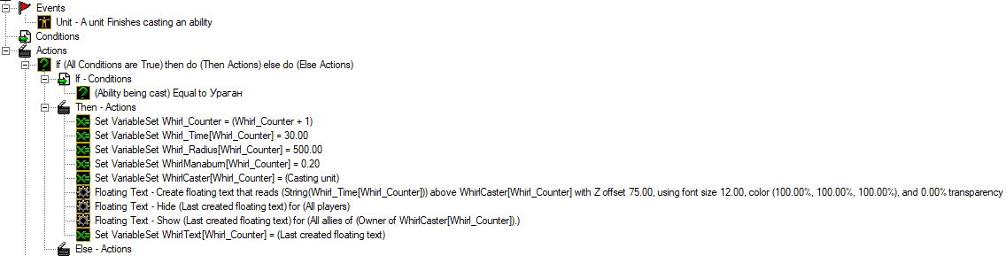 В первом при касте объявляются переменные, во втором синим выделена часть с плавающим текстом. Сама суть -- воронка вокруг персонажа, потом внутри будет ещё и око урагана, и ограбление караванов.