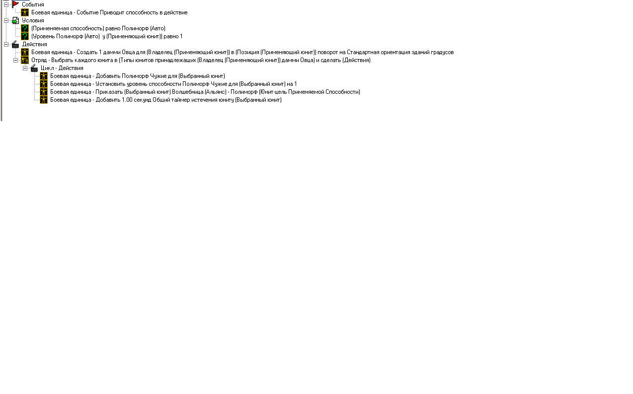 всех делаем врагами, морфим предателя в абилу. Заводной зверь 'Amec' - вызывает нейтральную зверушку (здесь не указано ничего, и нельзя указать какой тип призывается. Всегда рандомно вызывает зверушку: это может быть кроликом, лягушкой, енотом, цыпленком, свиньей, овца (часто выпадают именно эти зверьки, возможно есть другие, но это не попадались мне). Вшито в игре где-то). Зато можно указать количество вызываемых зверей. Эта абилка вставлена в одноразовый предмет. Вызывает навсегда (длительность задано на "ноль", но можно задать время действия вызова). Вызывает безграничное число юнитов. Это не совсем нейтральное существо, оно может подчиняться вашим указаниям (у нее есть, конечно, бродилка. чтоб не стояло на месте). Это существо больше создано для разведки, вы можете создать неподалеку от базы противника и заслать на базу. Враги не трогают нейтралов. В чем суть этой абилки? Если создать изначально цыпленка на карте, и заслать на базу врага, этого цыпленка тут же заметят как врага, и сразу же прирежут. А если вызвать через эту способность, то враг игнорит вашу зверушку (в некоторых играх против ботов надо попробовать сделать препятствие - если узкие проходы просто загородить цыплятами, то возможно пройти будет сложно). Единственное, что настоящий игрок может заподозрить и убить.