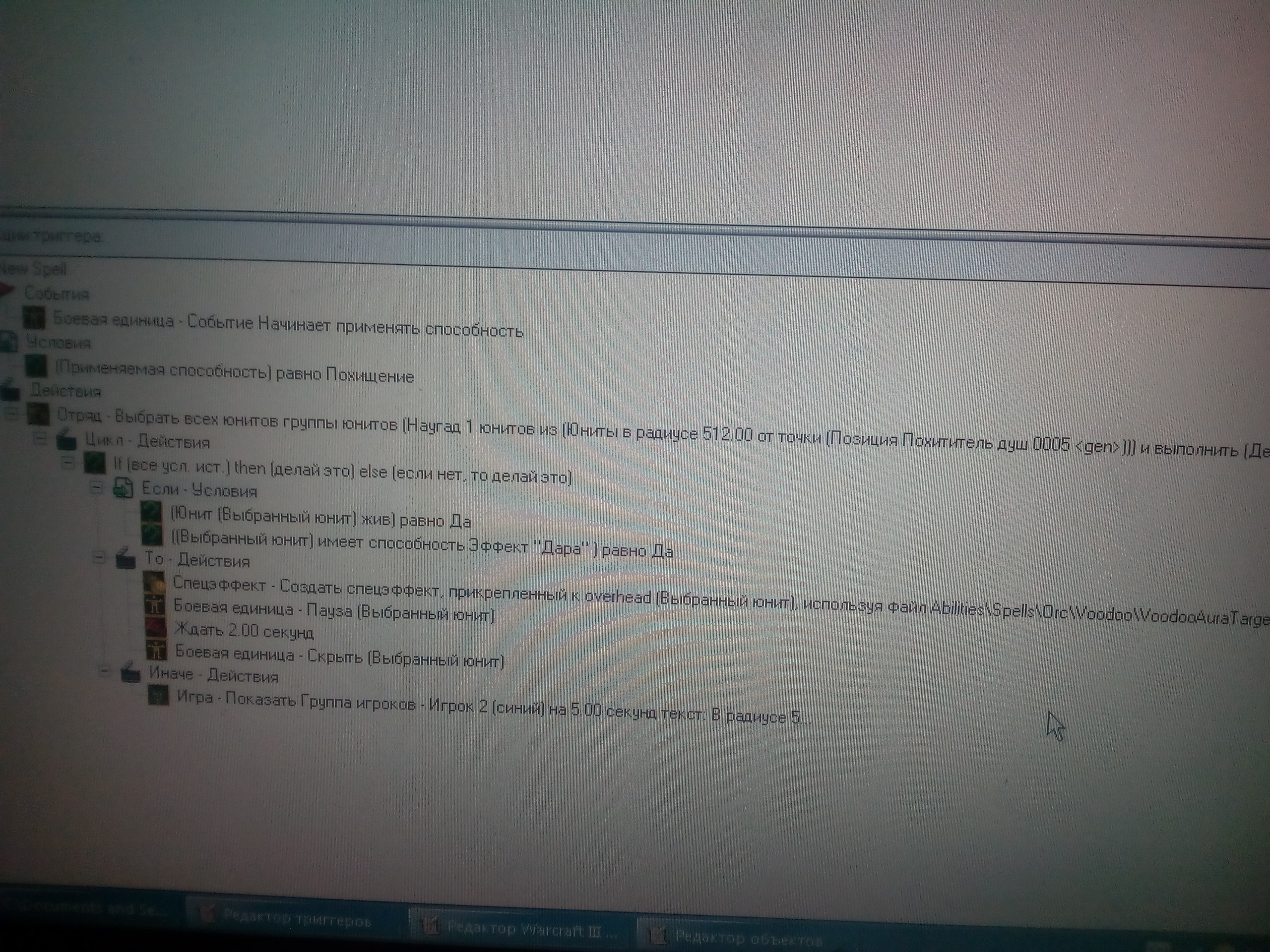 Во-первых, попробуй поставить событие Приводит способность в действие. Во-вторых, бафф Эффект "Дара" может на юните отсутствовать, если его накладывает способность, нужно какую-то минимальную задержку сделать. В-третьих, в действиях с группой нельзя использовать Ждать, но в данном случае выбирается лишь один юнит потому может работать, только сама реализация мне кажется неправильной, если способность похищает не случайного юнита, а конкретно того, на кого направлена, то есть же (юнит-цель способности) или как-то так.