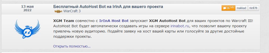 » WarCraft 3 / Бесплатный AutoHost Bot на IrInA для вашего проекта