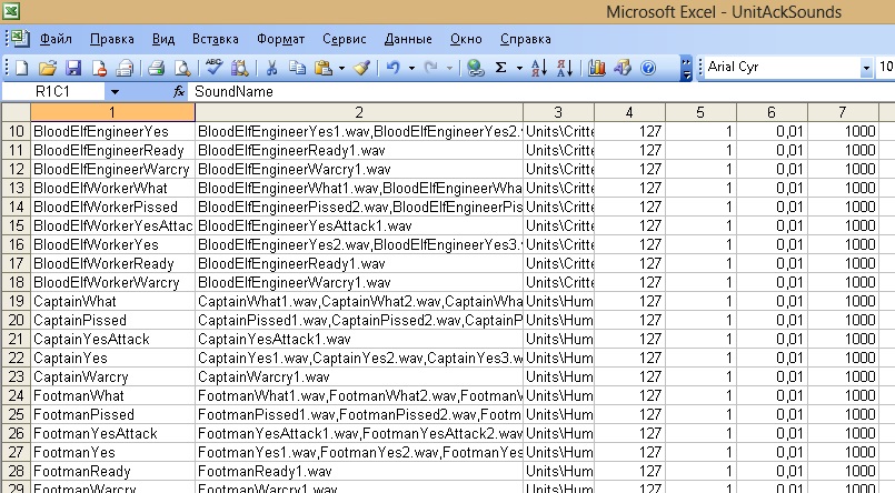 в архиве war3x.mpq нашел этот файл. в нем вторая колонка - перечисляются имена файлов, а первая - названия звуков (pissed и т.д.) для всех юнитов
