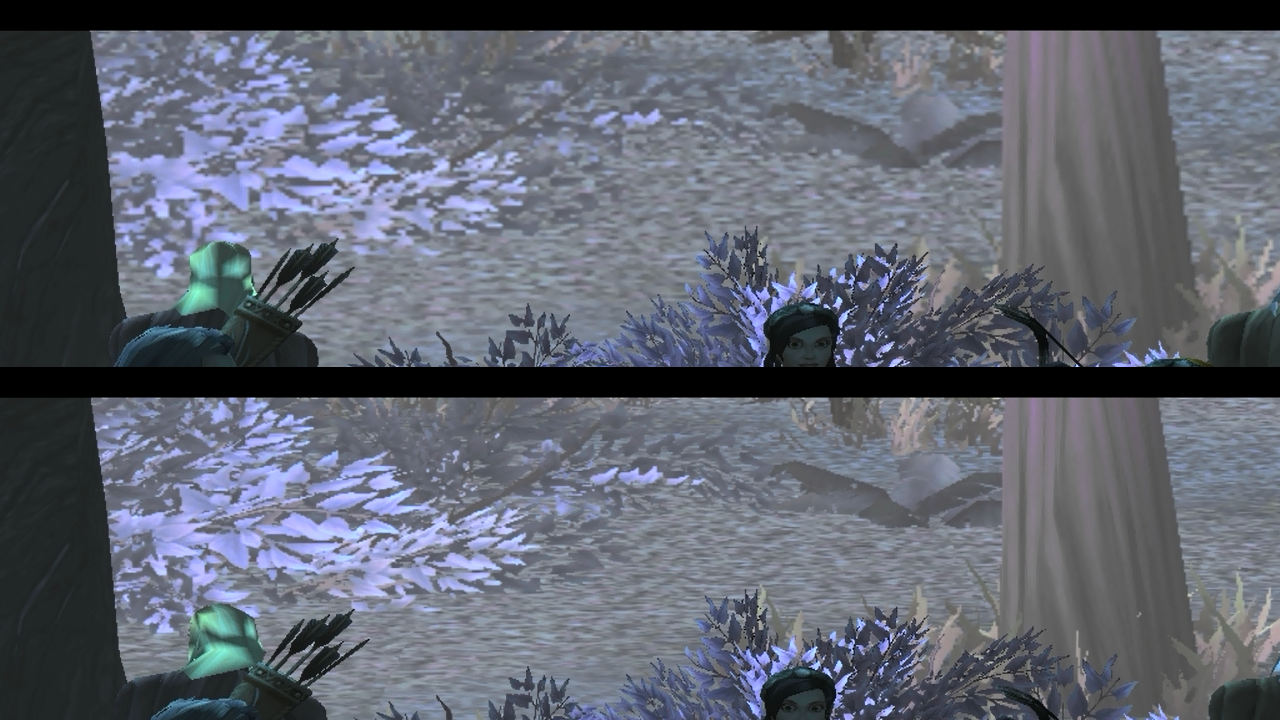 Не самый лучший тестовый скрин из видео плеера, но тем не менее красноречивый, особенно на стволе дерева справа, верхний скрин с ширмой 1600х900, нижний в два раза больший.