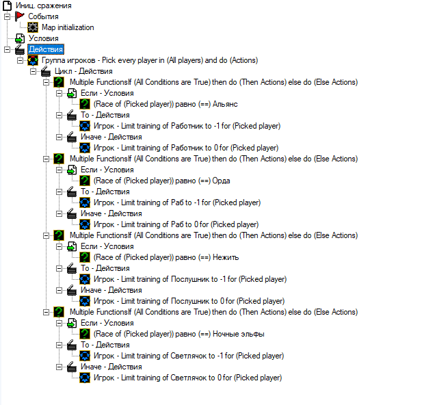 Вот как будет выглядеть триггер, в зависимости от расы ты ставишь ограничение найма в 0 (если нельзя нанимать этого строителя) и -1 (если раса подходит).