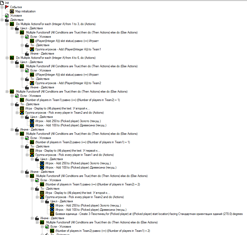 У меня система основанная на разнице количества игроков в двух командах. И только от разницы зависит, какой команде и что давать. То есть первый цикл нужен чтобы "посчитать" кол-во игроков и узнать разницу. Второй цикл уже для раздачи доп ресов и войск нужным игрокам.